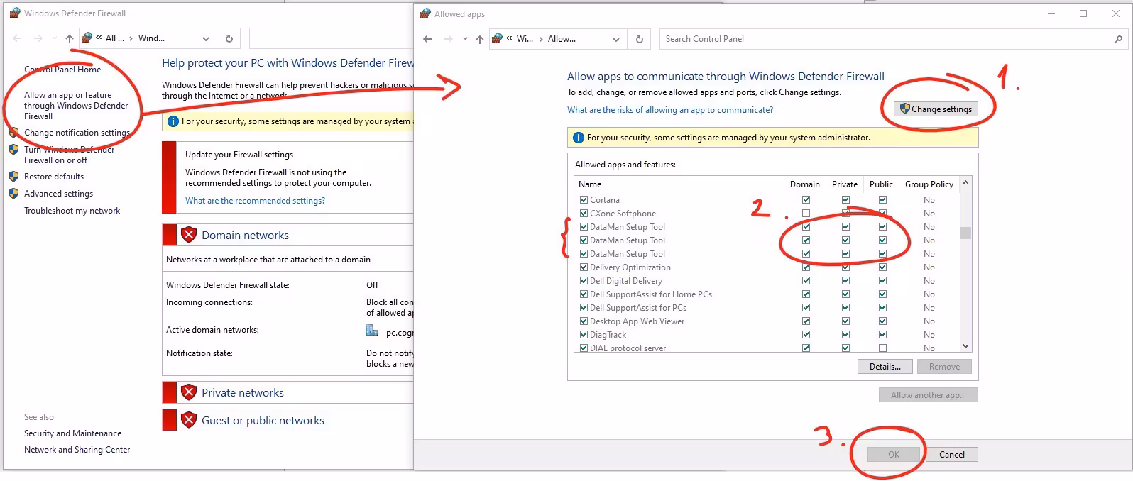 To ensure DataMan Readers are able to send and receive UDP packets for automatic detection in DataMan Setup Tool, the software must be allowed to communicate through the Windows Firewall. Typically new installations of the software will come with this enabled, preventing DataMan cameras from showing up in the Setup Tool device list, so to allow UDP Cognamer packets used to announce camera presence to the Setup Tool software on the network are not blocked by firewall perform the following steps: