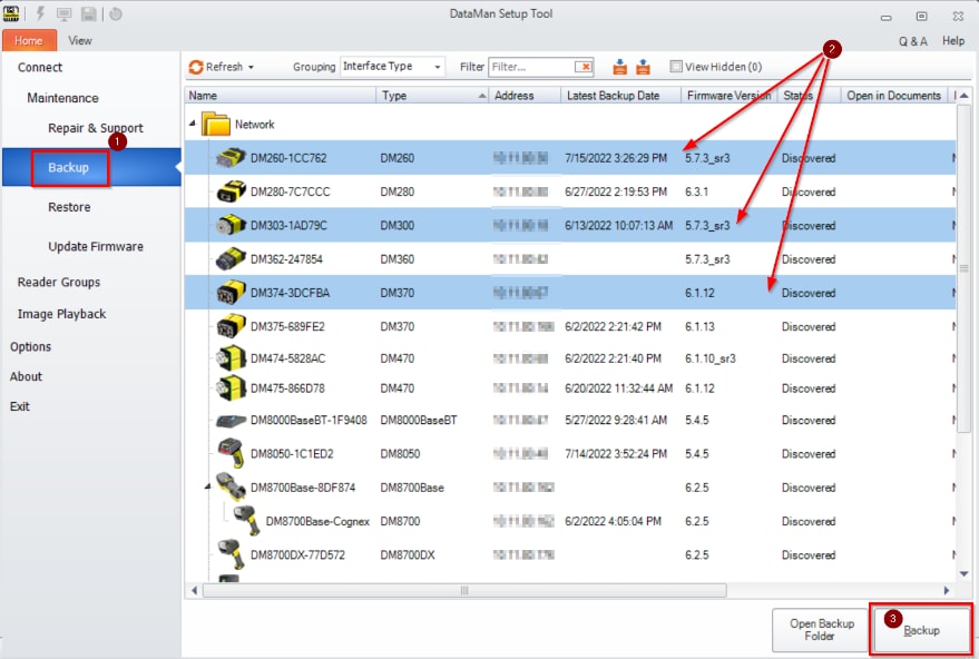 3. You can see the destination folder by clicking “Open Backup Folder” in the lower right. This will take you to the default location backups are stored here: …\Documents\Cognex\DataMan\Backups.