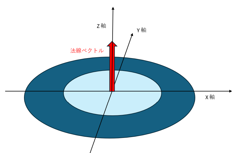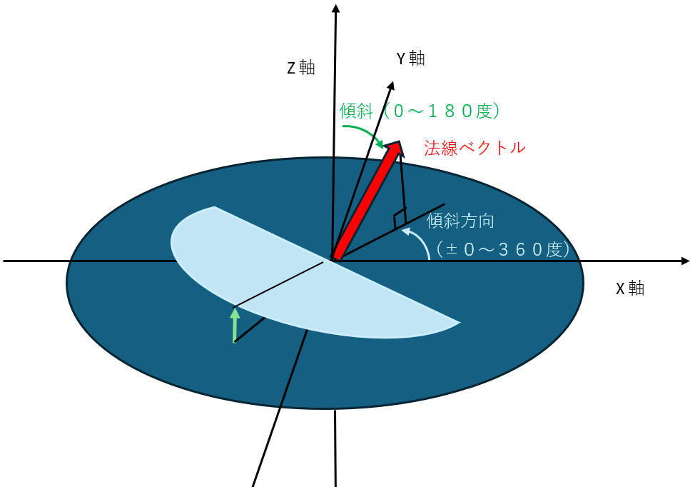 そしてその傾斜した面の法線ベクトルをXY平面に投影した時に、投影されたベクトルがX軸から何度回転しているかを表す値が傾斜方向である。