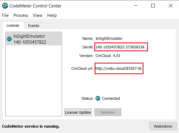 The cloud license in CodeMeter does not show a valid url.