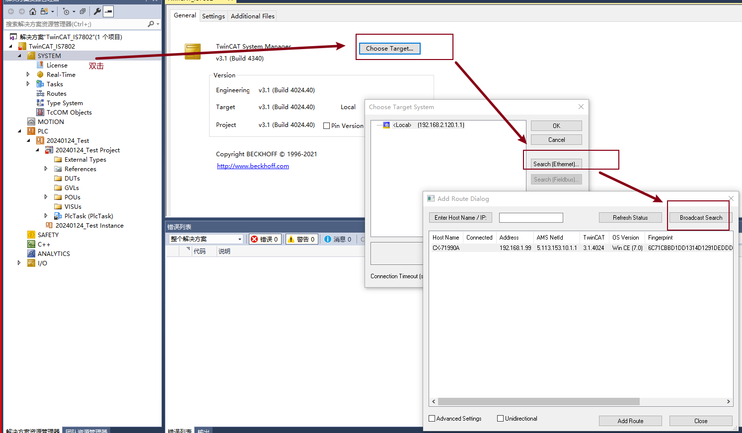Double click on “SYSTEM”, then go to “Choose → Search[Ethernet] → Broadcast Search”.