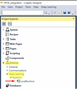 Rename the VisonPromDeep Learning Device in the Cognex Designer Project Explorer to LocalRuntime and import again the runtime workspace double clicking on the VisionProDeepLEarningRuntime  Block